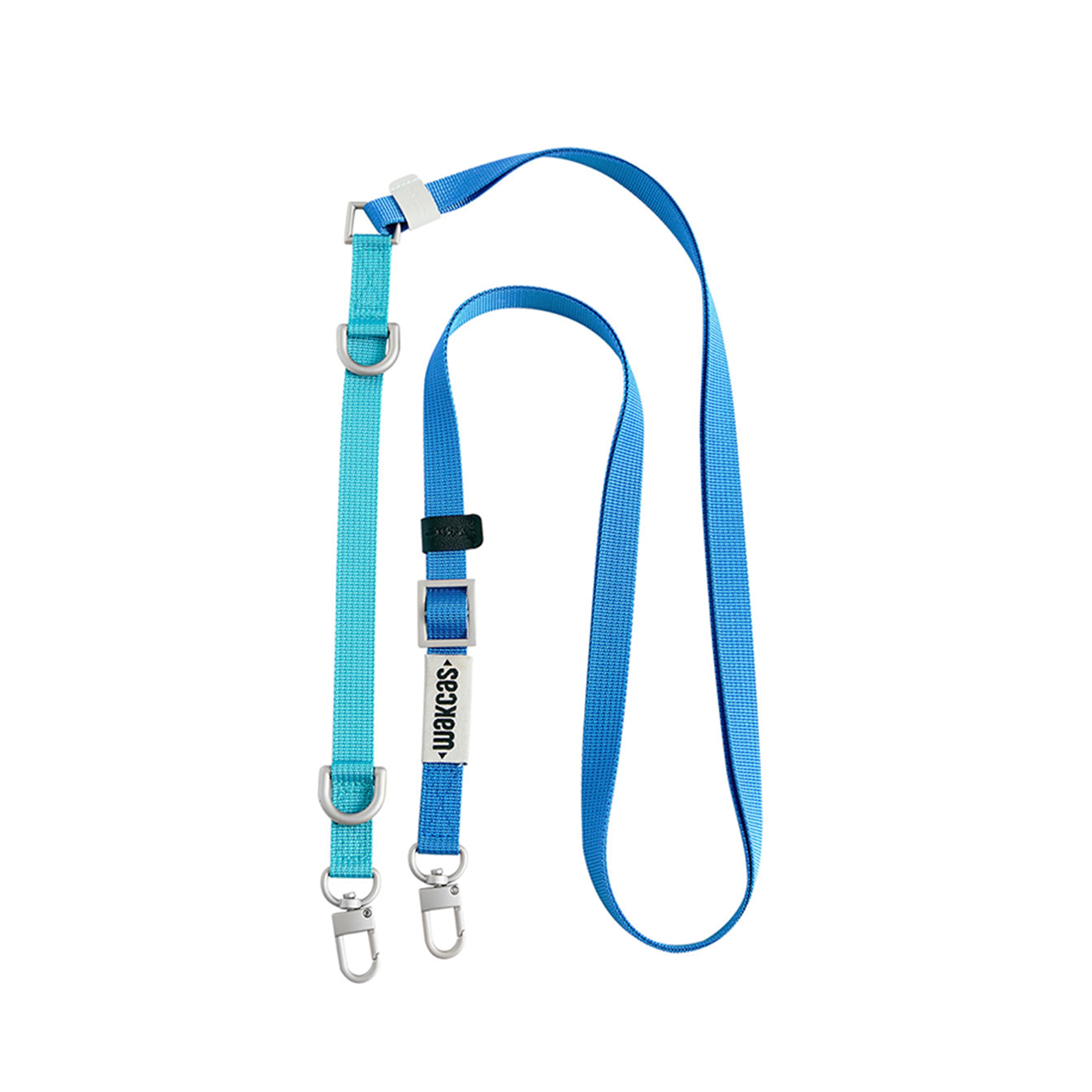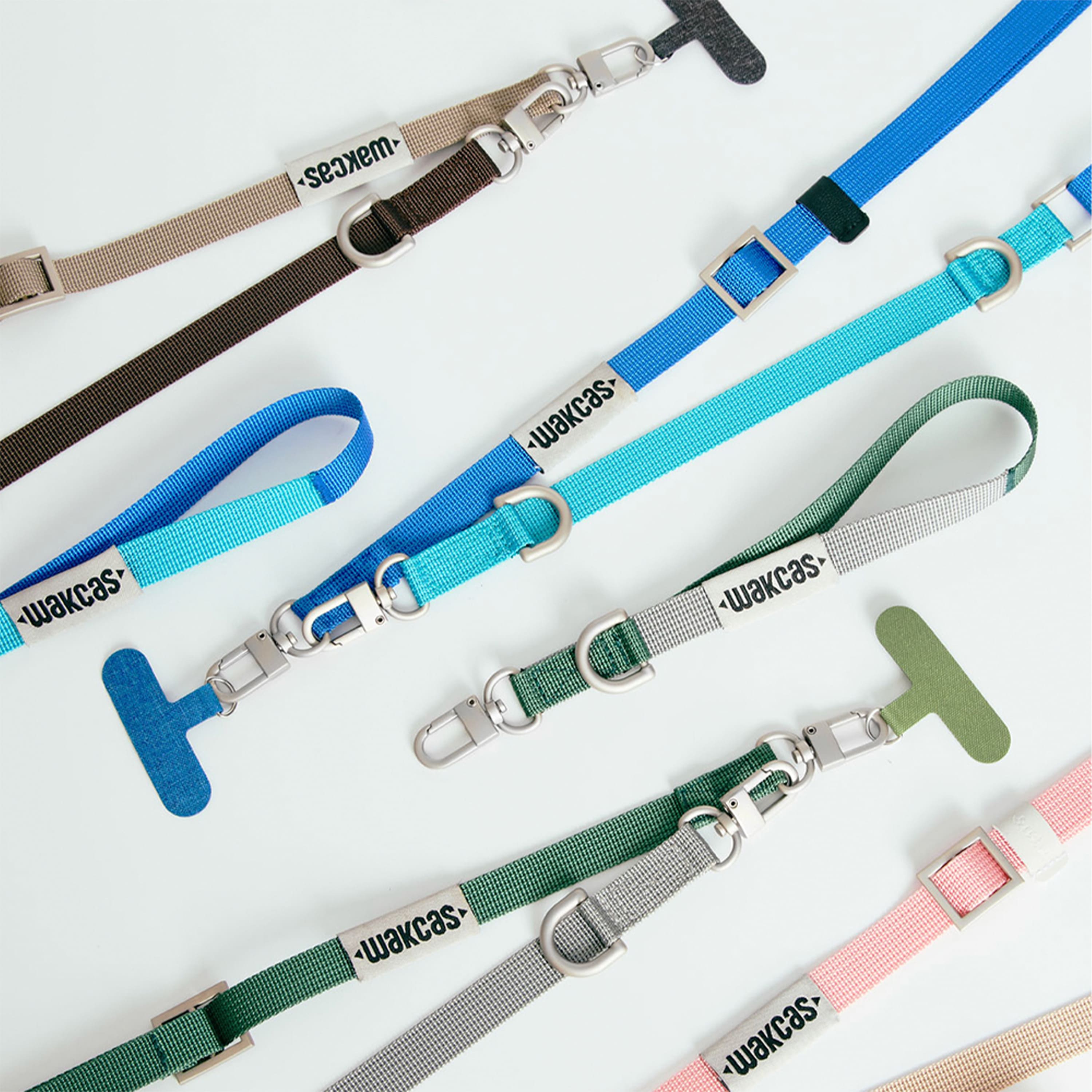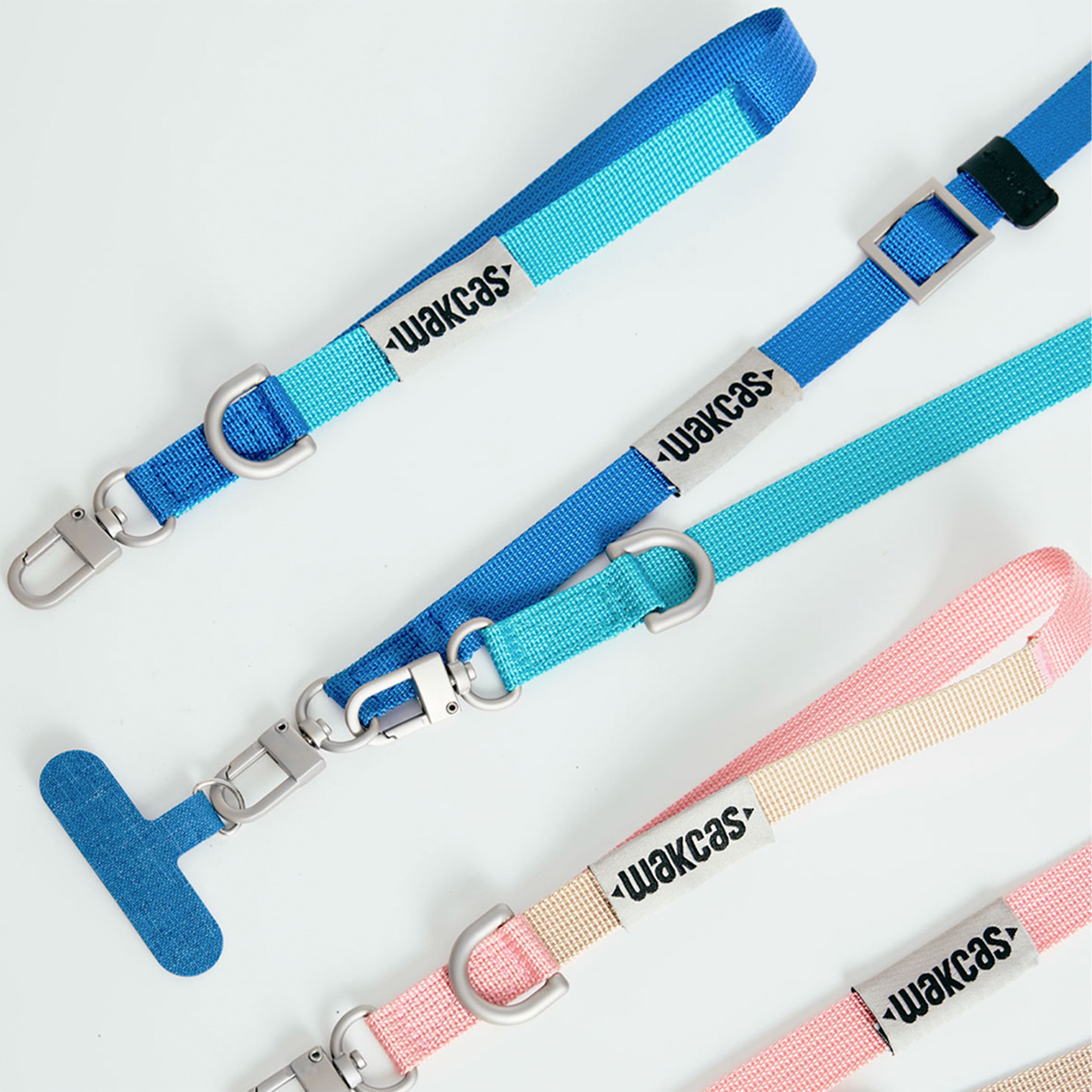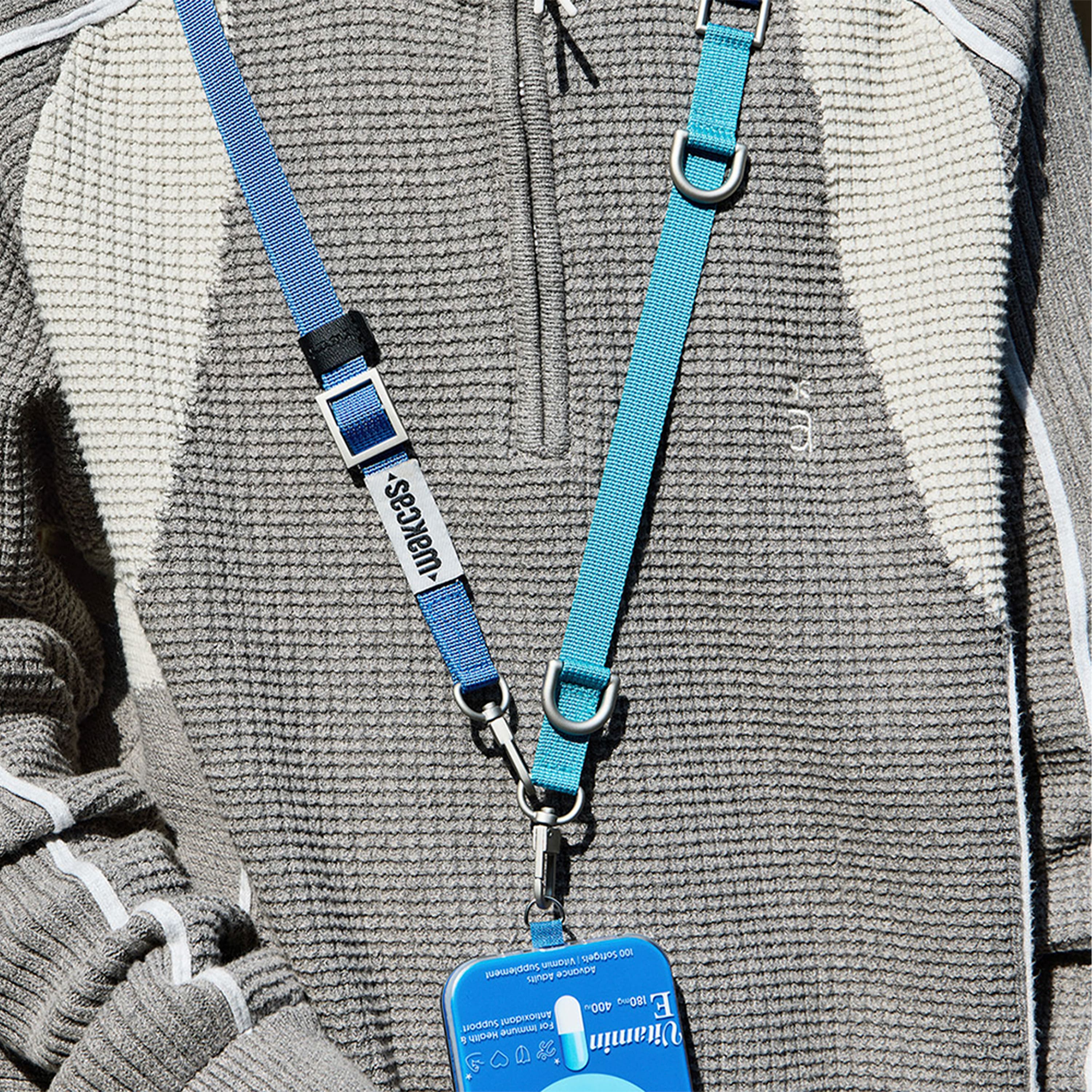 Изготовлен из прочного нейлона в комбинации голубого и глубокого синего цвета. Металлические карабины обеспечивают надёжное крепление к чехлам, сумкам, ключам или другим предметам, а регулировка длины — удобную посадку под любой рост и стиль ношения.