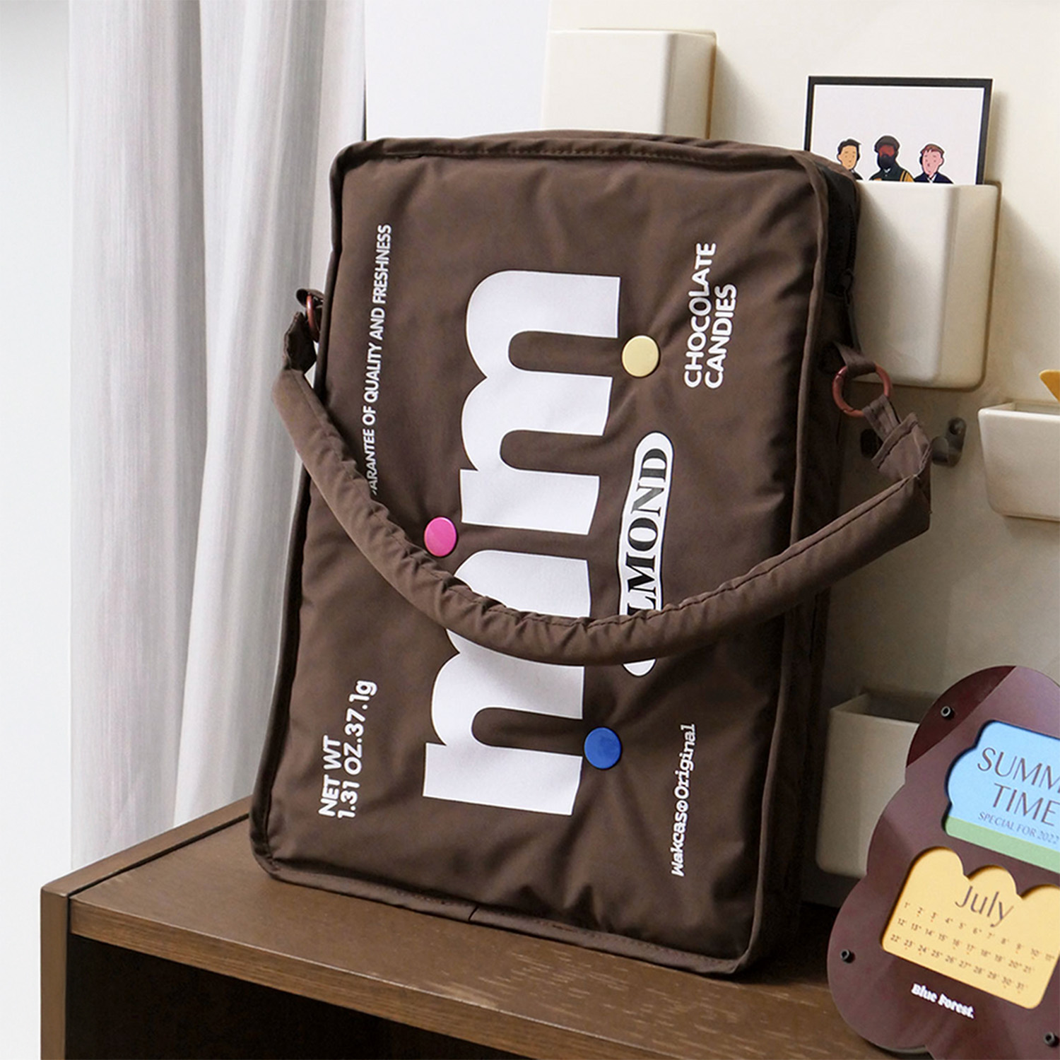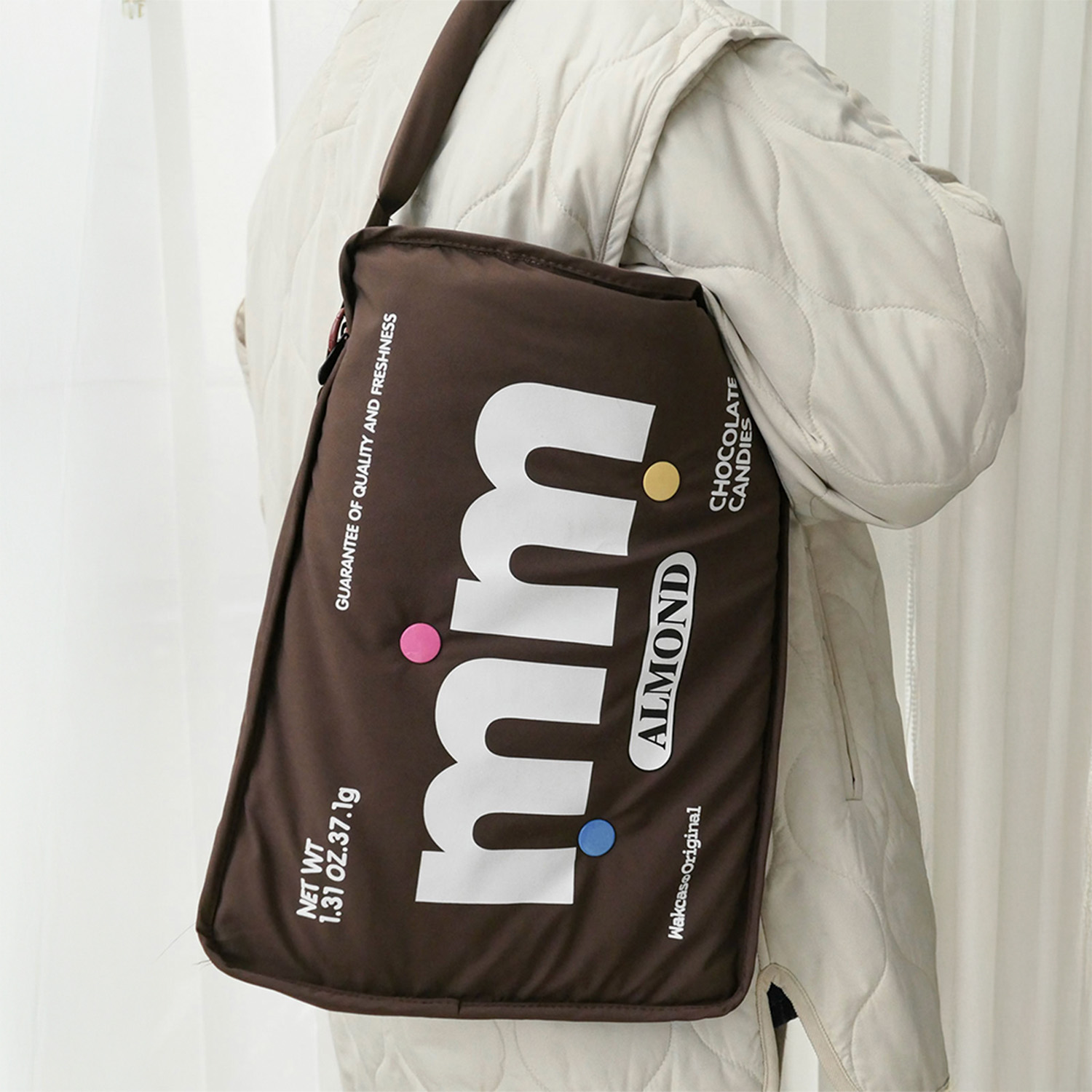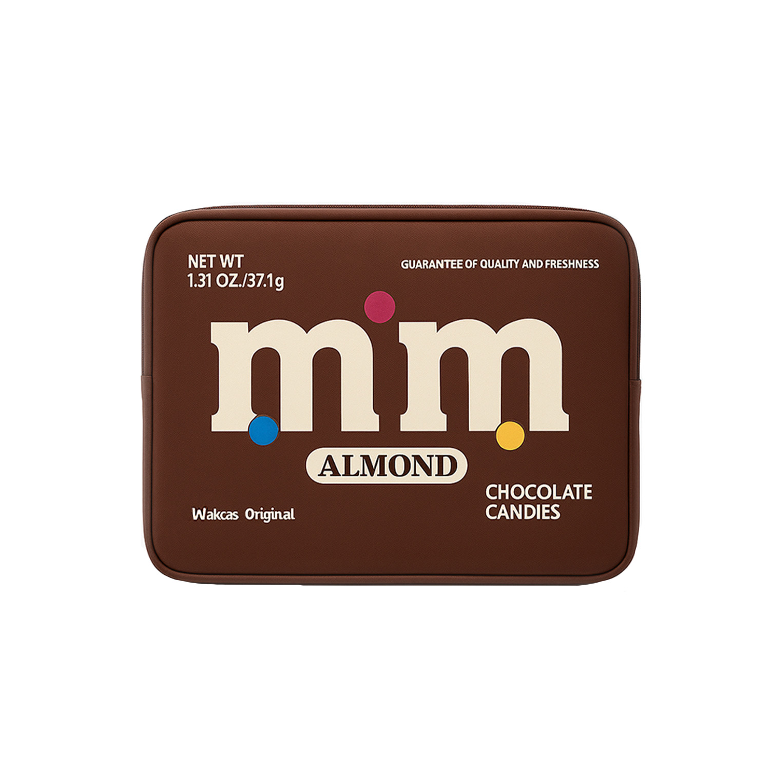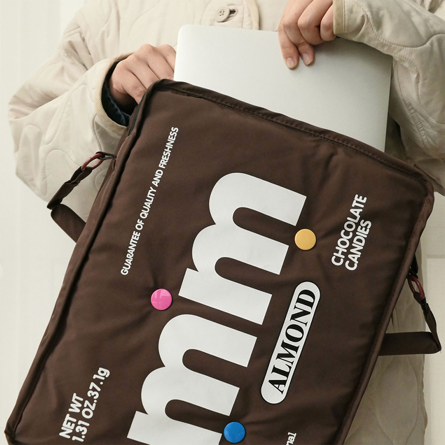 Яркая и узнаваемая сумка для ноутбука выполнена в стиле упаковки конфет m&m’s.