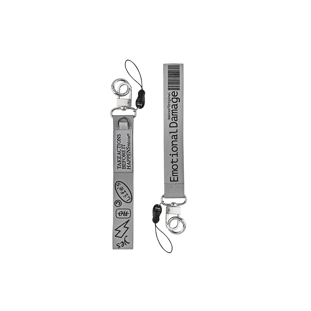 Изготовлен из прочного нейлона в сером цвете с оригинальными принтами. Металлическое кольцо и карабин позволяют легко крепить ремешок к ключам, чехлу телефона, сумке или другому аксессуару.