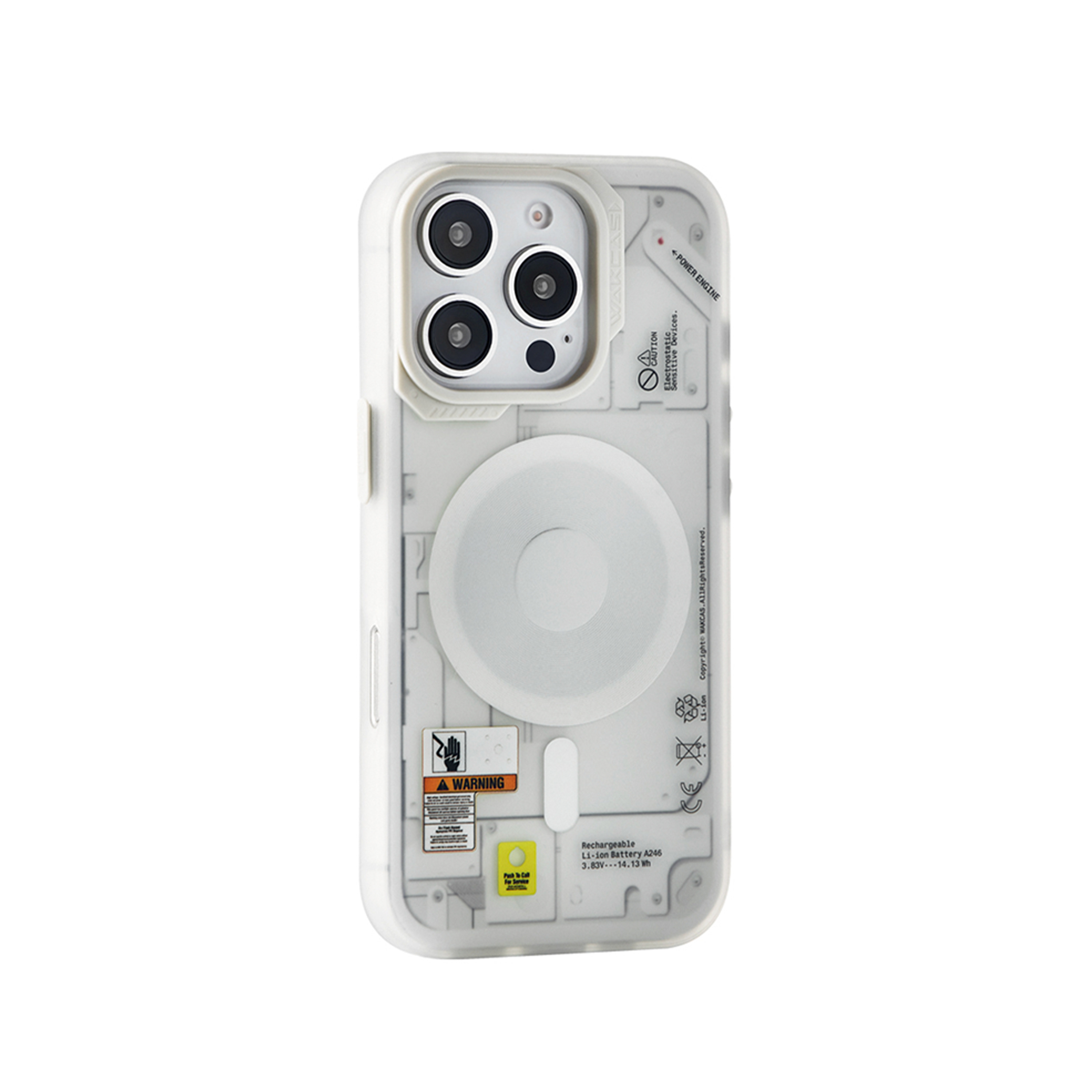Современный чехол в полупрозрачном белом цвете, оформленный в стиле аккумулятора.