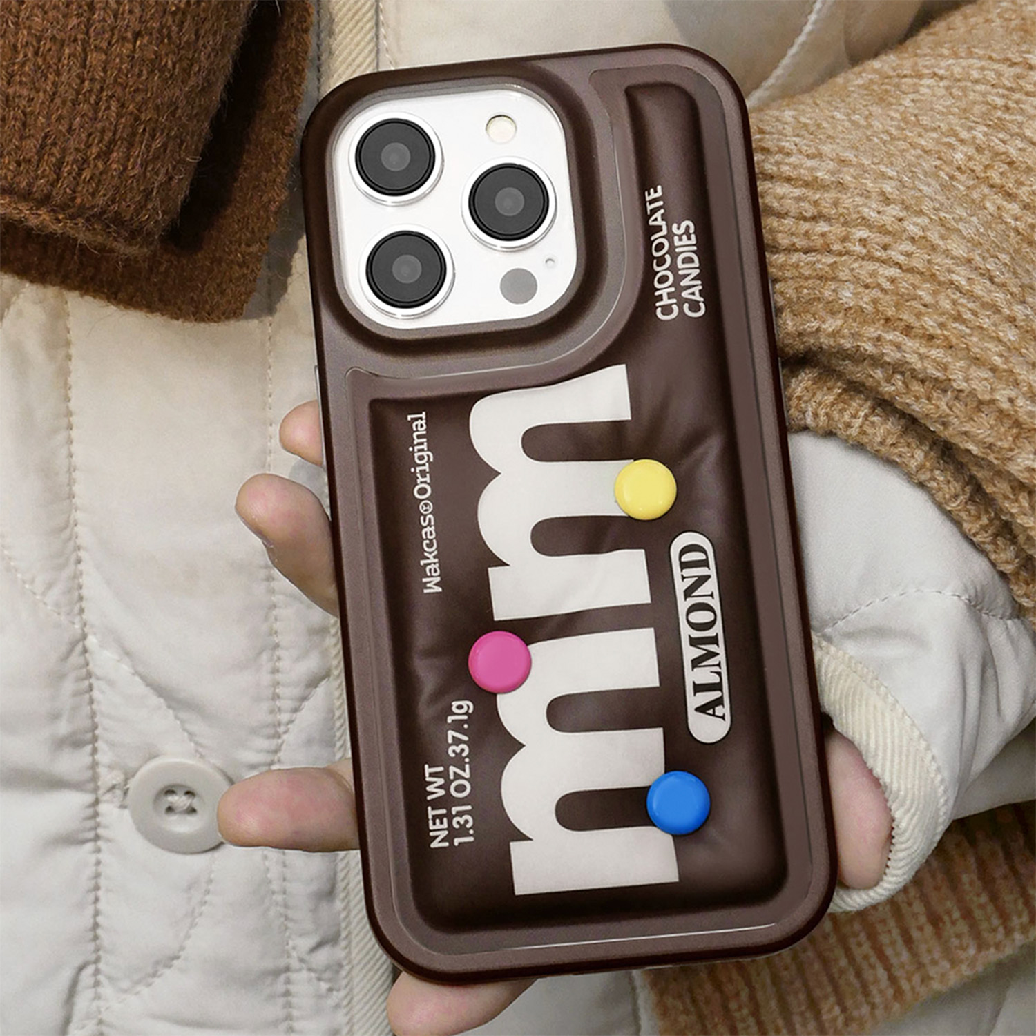 Весёлый и необычный чехол в виде упаковки шоколадных драже M&M's. Объёмные элементы конфет и текстура "мятой" обёртки создают эффект настоящей шоколадки — захочется съесть, но это всего лишь чехол.