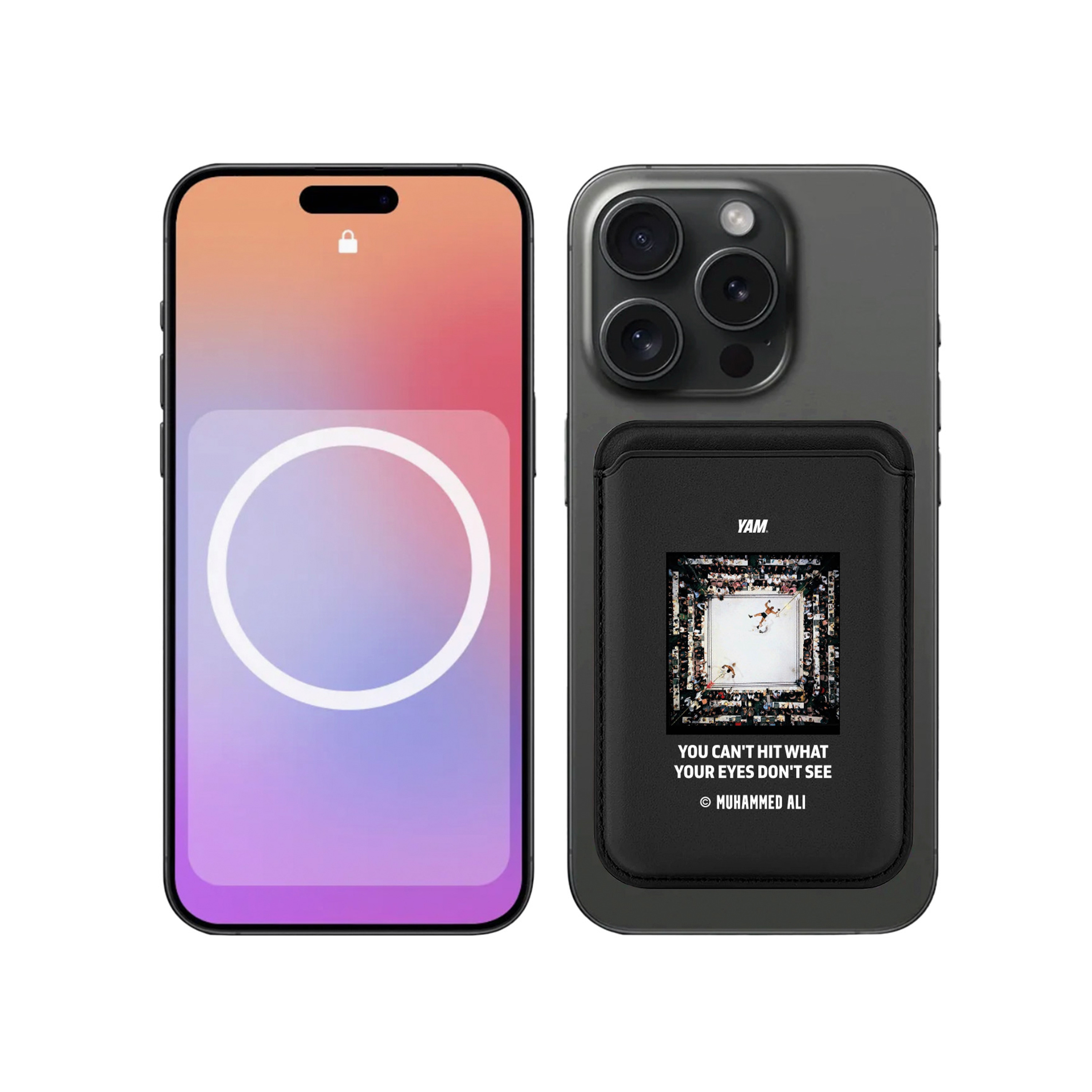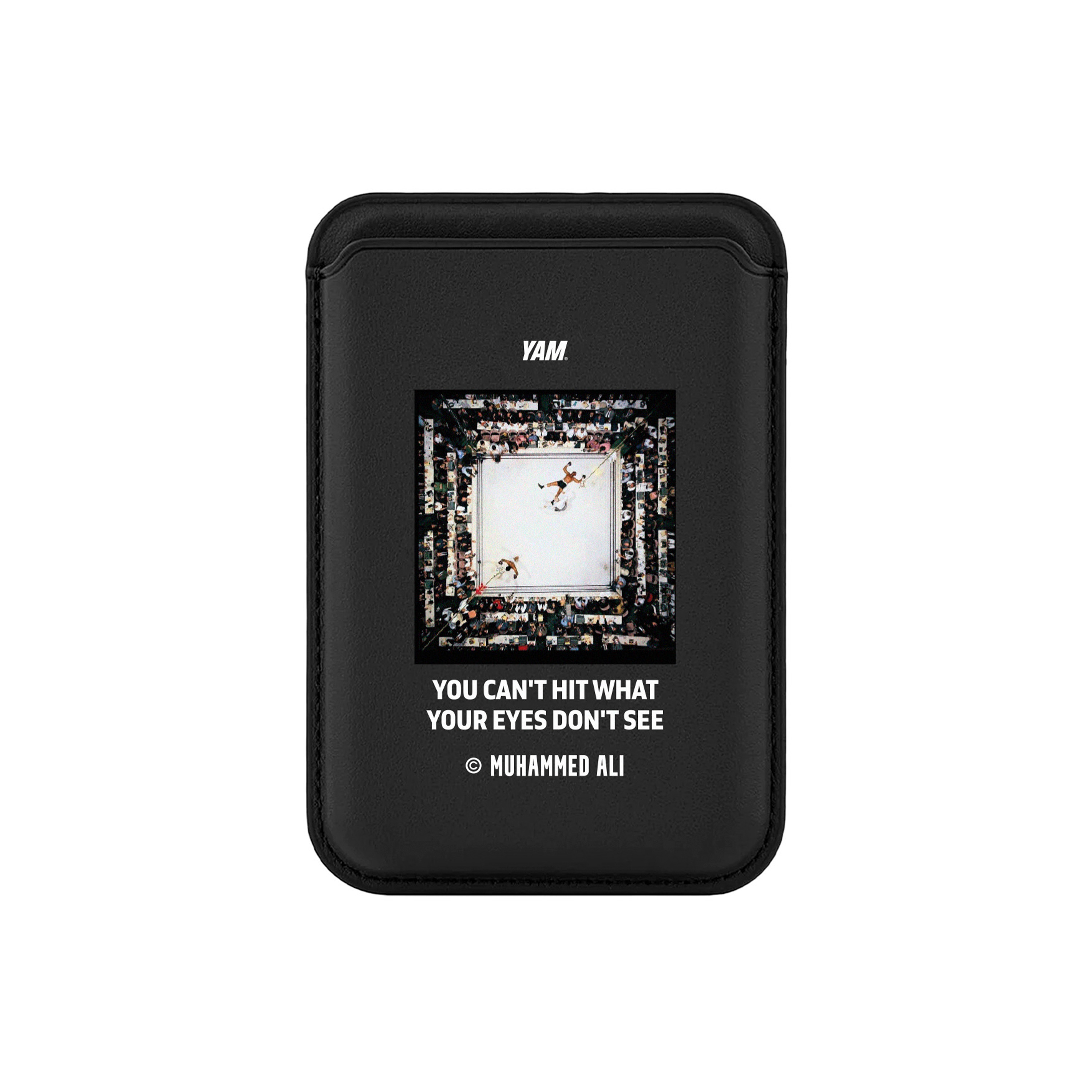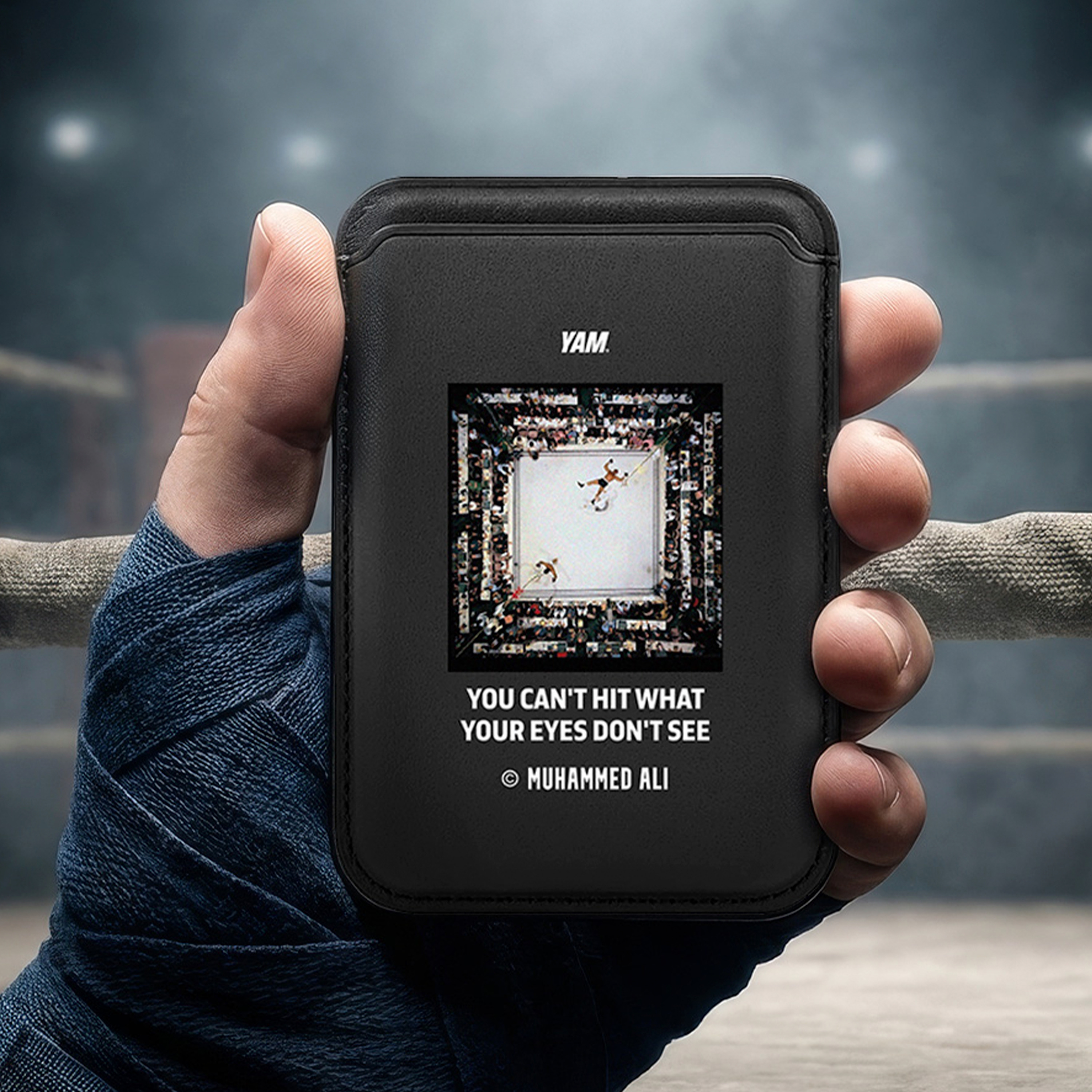 Минималистичный черный картхолдер с акцентом на культовый момент истории бокса.