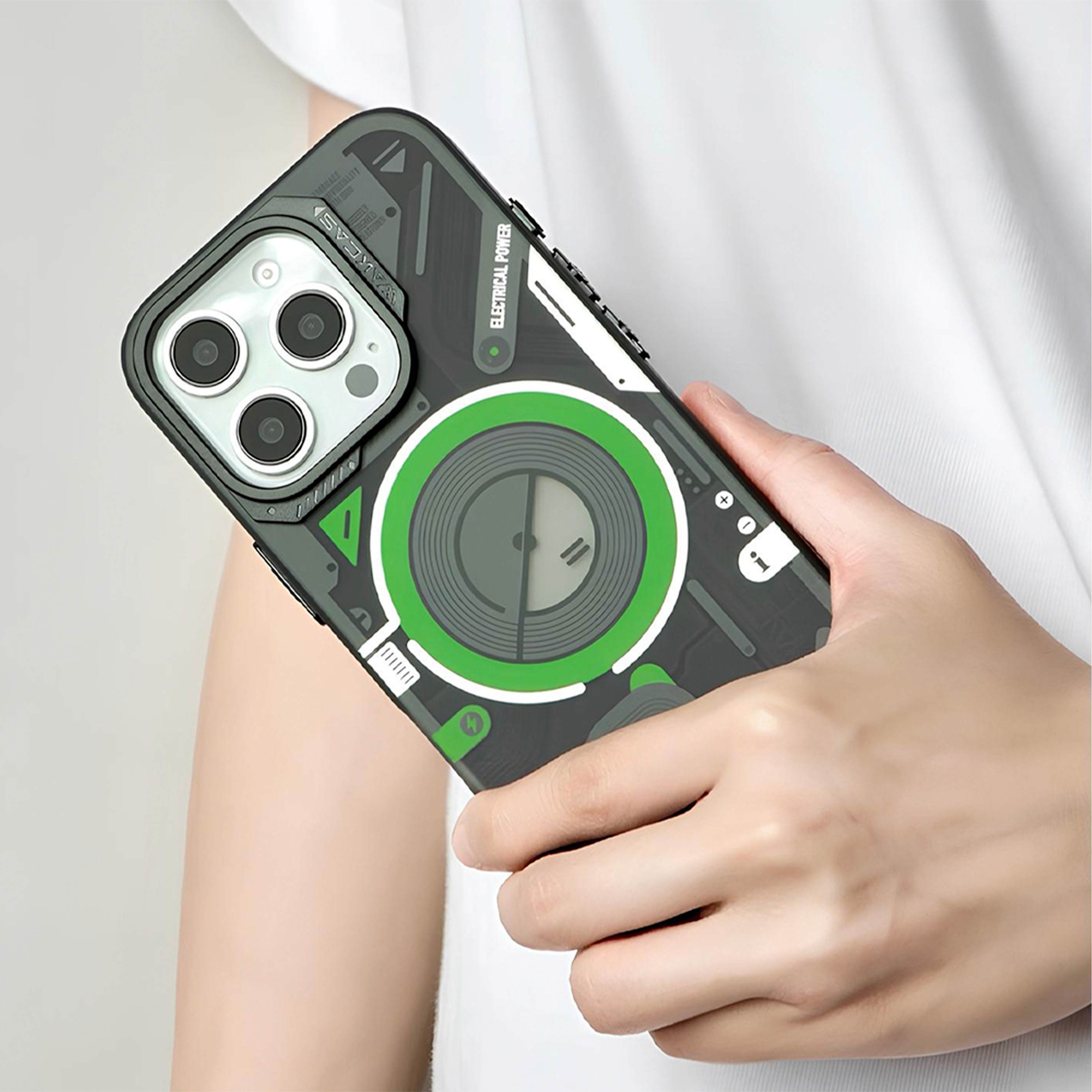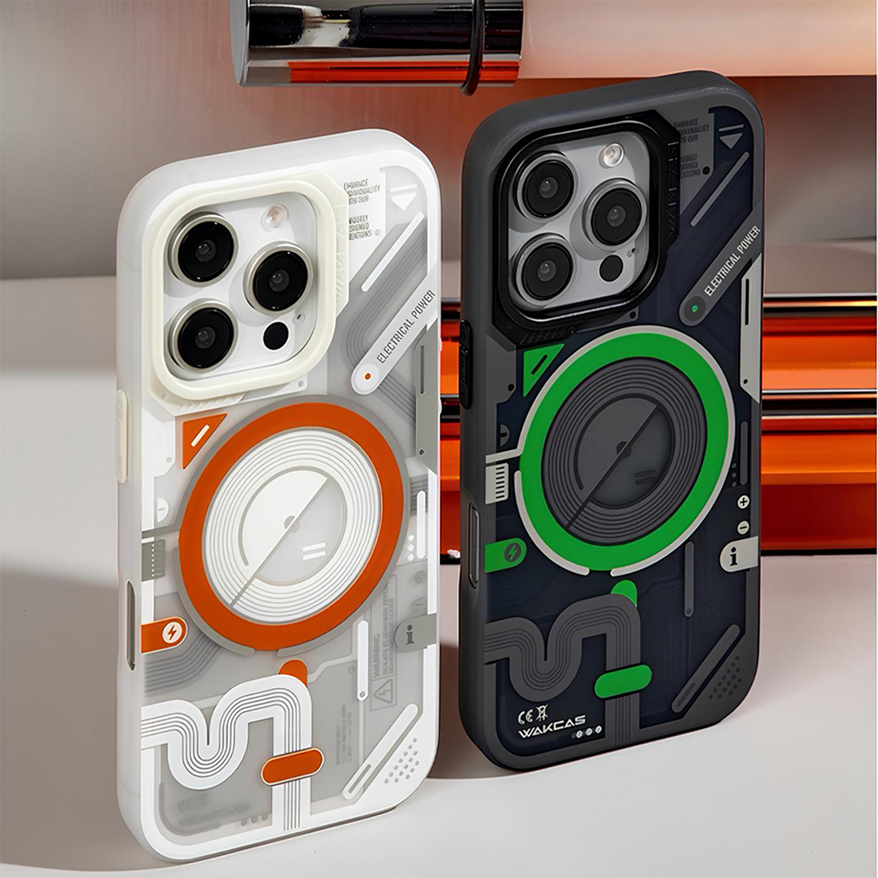 Футуристичный чехол с прозрачной вставкой и яркими акцентами создаёт эффект технологичного устройства и подчёркивает стиль