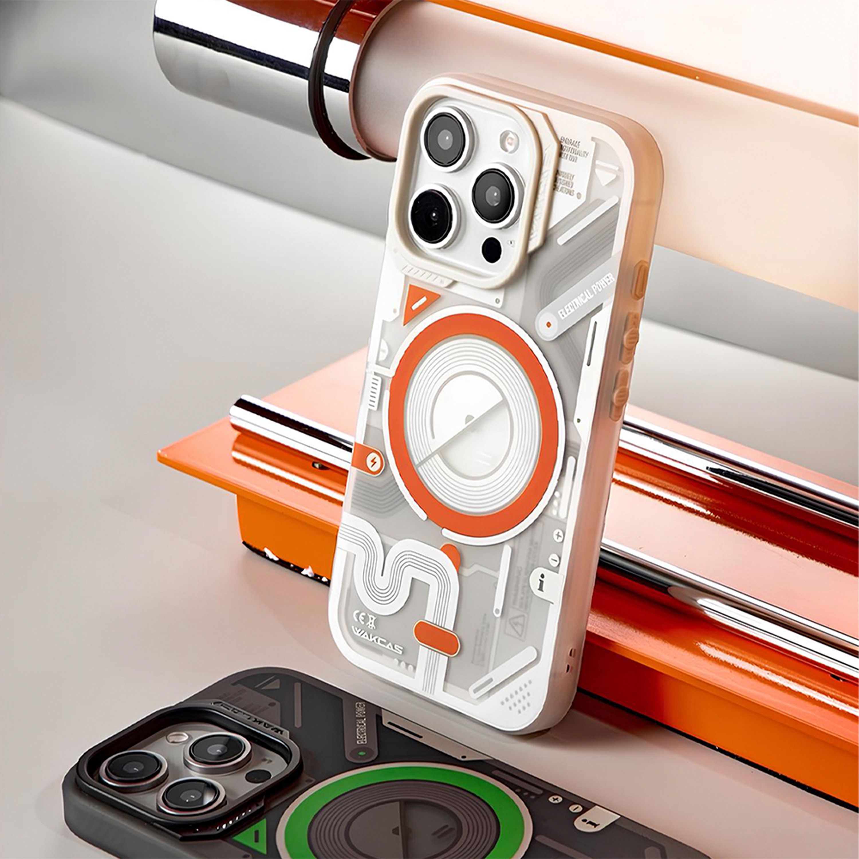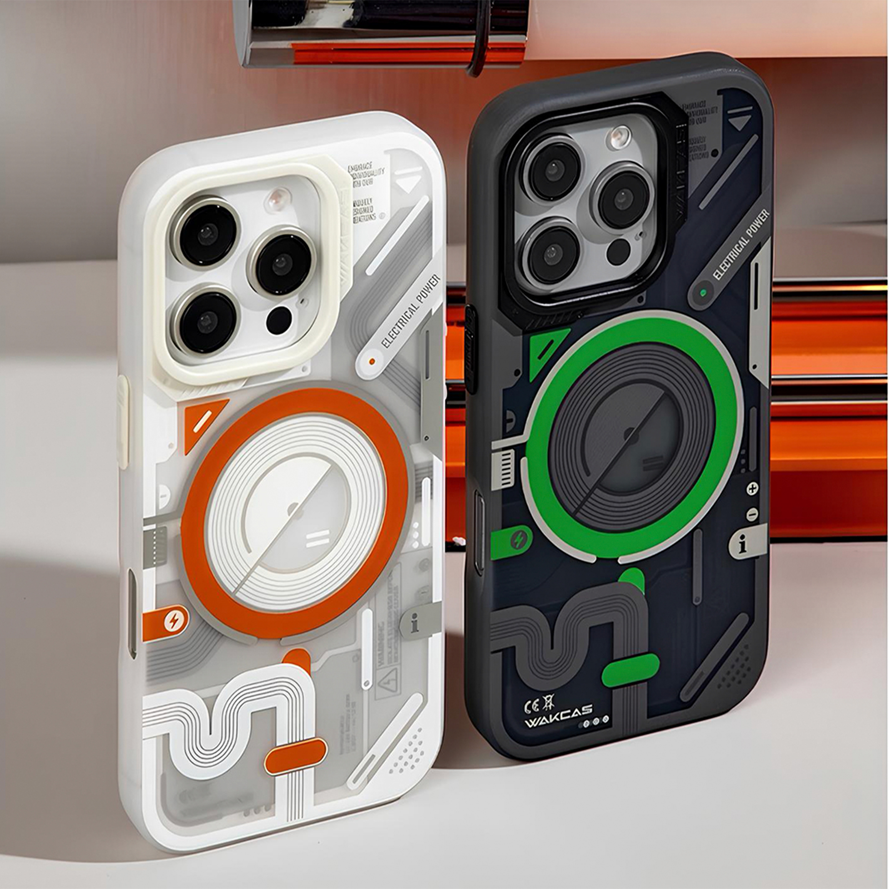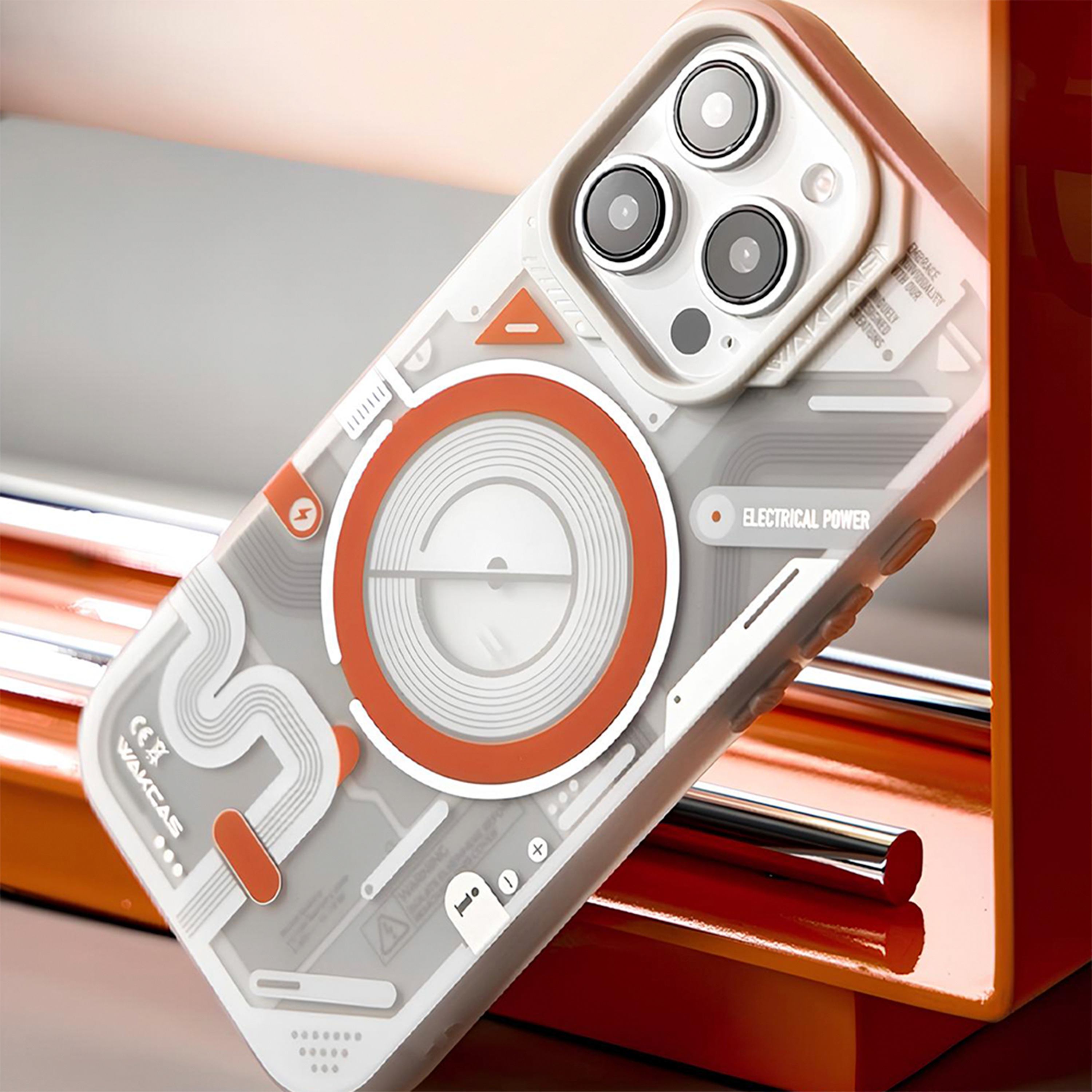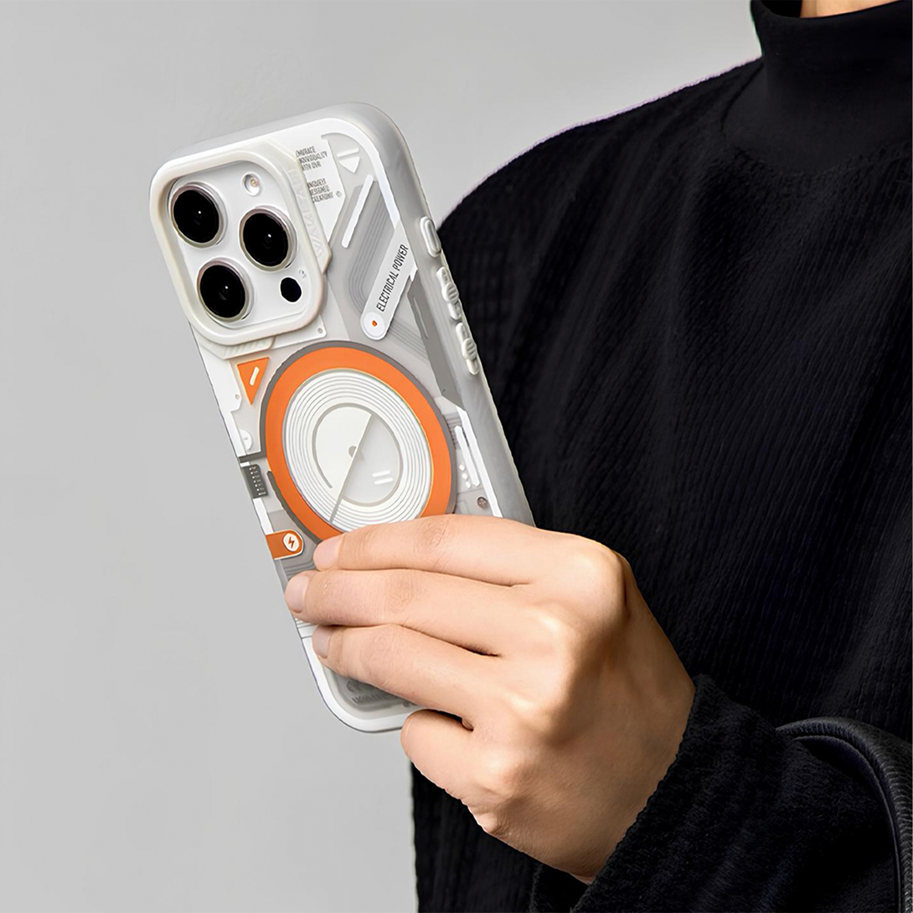Футуристичный чехол с прозрачной вставкой и яркими акцентами создаёт эффект технологичного устройства и подчёркивает стиль