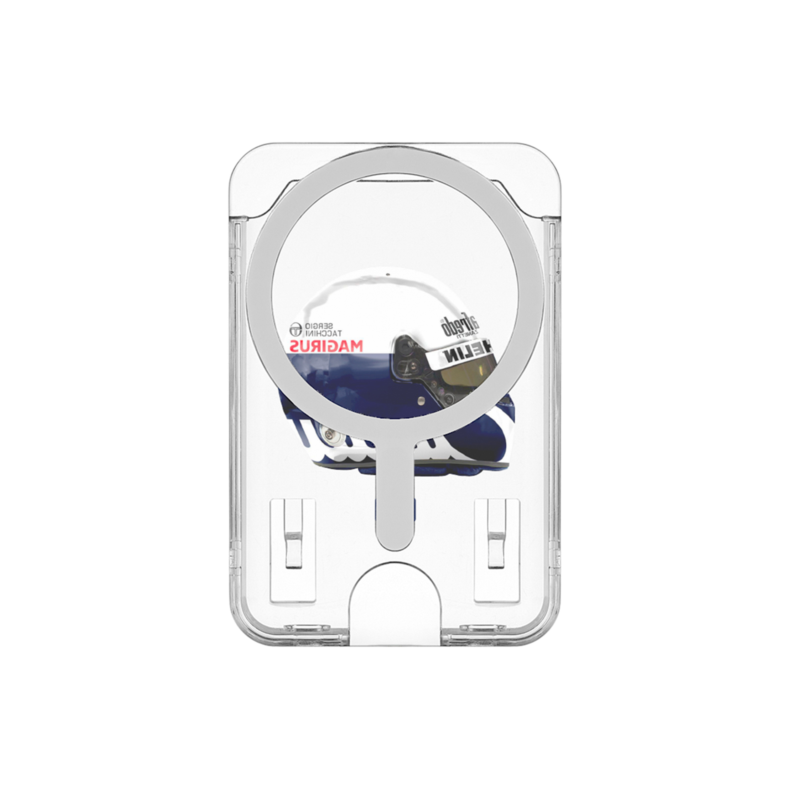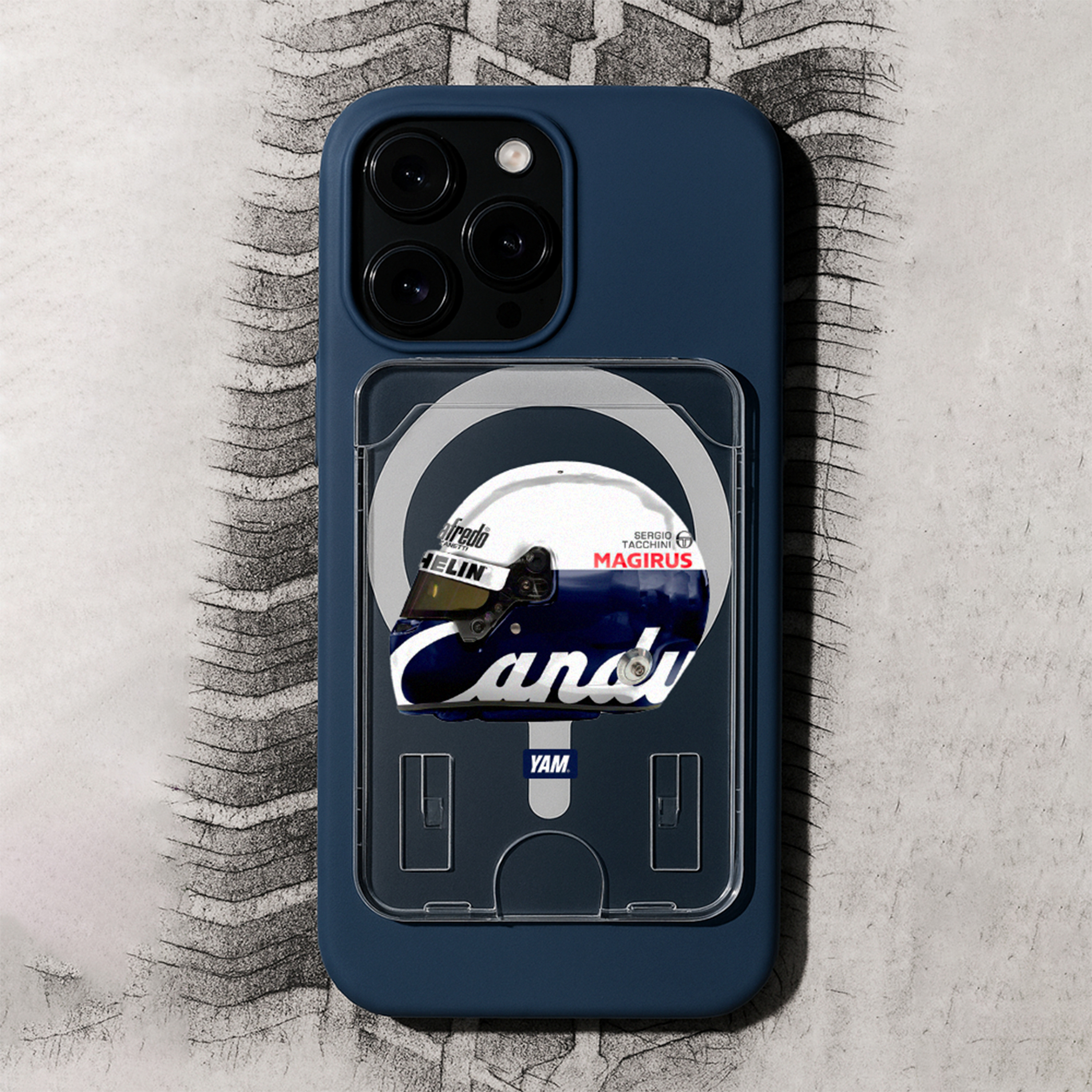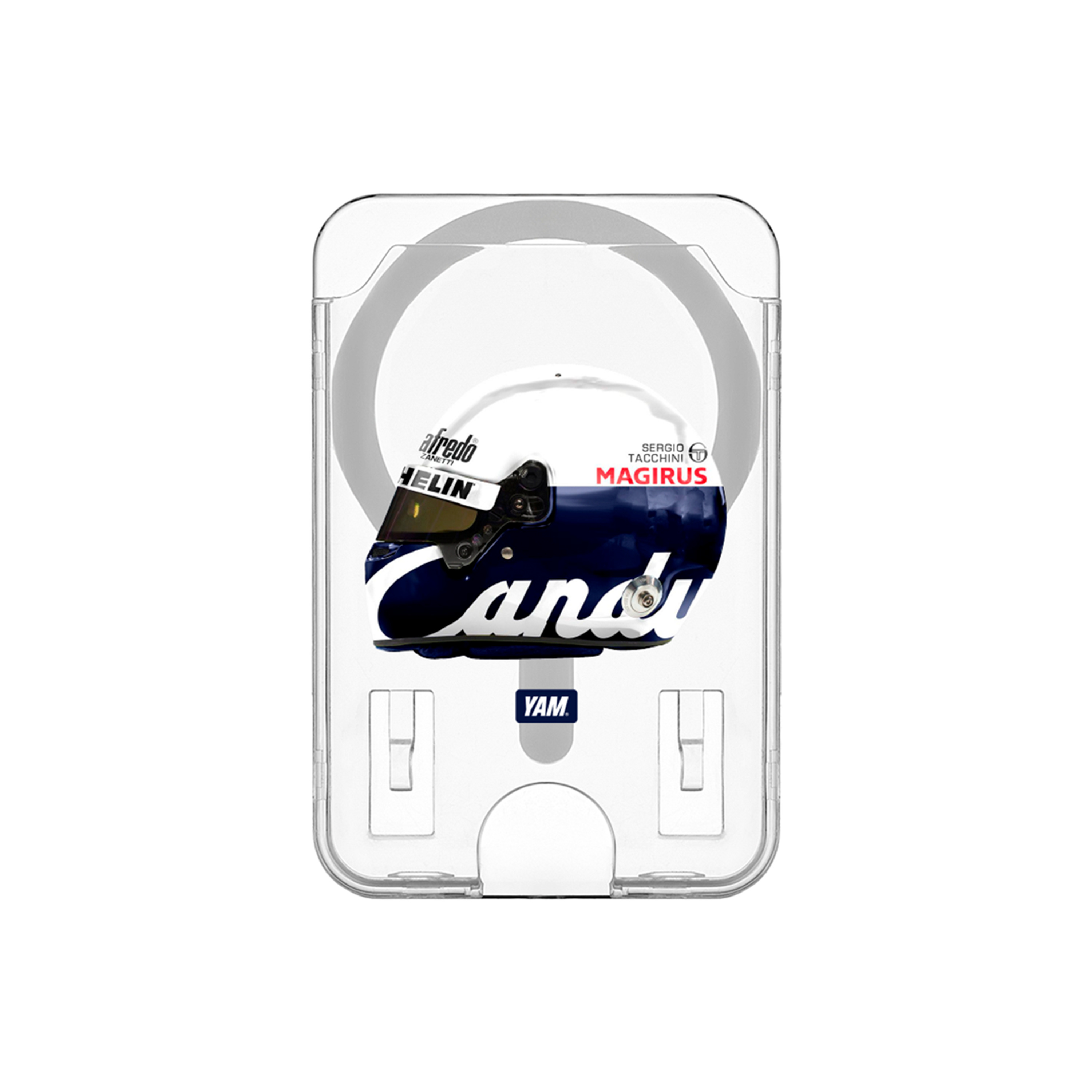 Этот аксессуар создан для тех, кто чувствует пульс автогонок даже в повседневных деталях. В центре дизайна — культовый шлем с историческим ливреем Candy, символом смелости, риска и золотой эпохи гонок.
